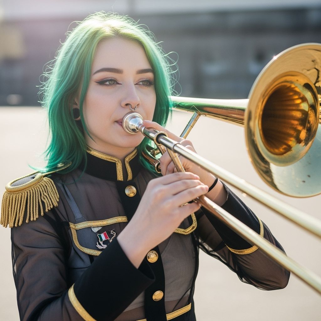 A high-resolution photo captures a Scottish teen with green hair and a nose ring playing a massive trombone. She wears a military-inspired uniform, with bright natural light and a cinematic shallow depth of field.