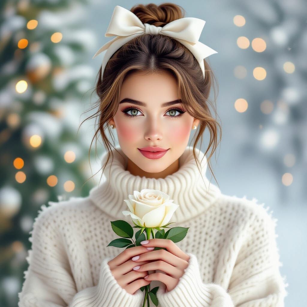 This image depicts a young woman with chestnut hair and gray eyes, holding a white rose. Rendered as a delicate watercolor sketch with warm lighting, it features a wintry, fairytale aesthetic.