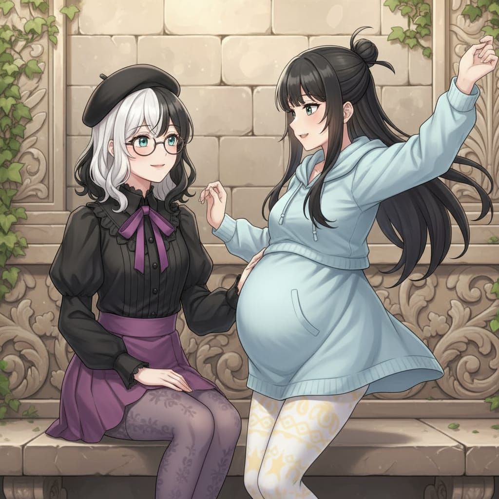 This anime-style image features a woman with striking black and white hair, turquoise eyes, and gothic fashion. She sits on a bench watching her girlfriend dance.