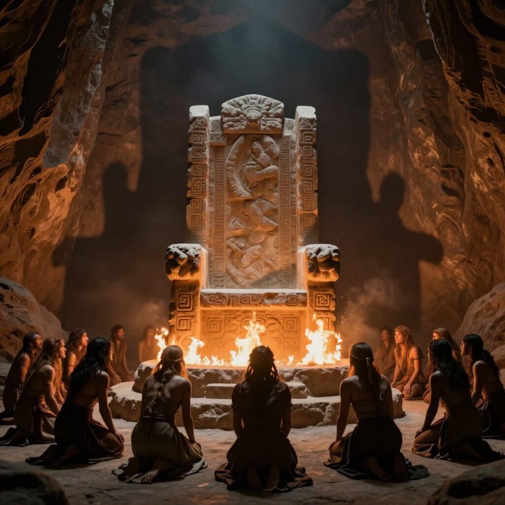 This image depicts a dramatic scene of early humans before a throne of stone and fire. Cinematic lighting and an epic scale create a powerful atmosphere.
