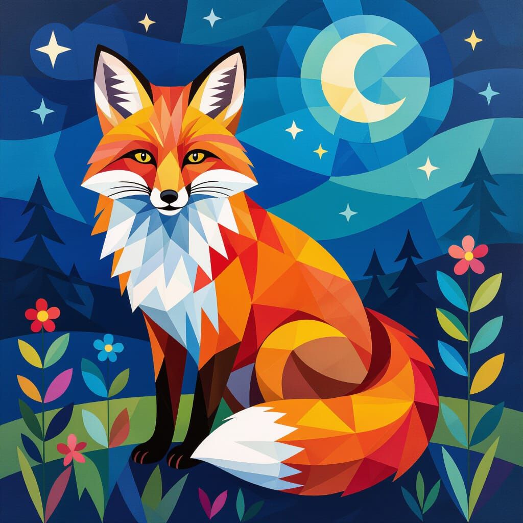 A vibrant stylized fox on a summer night, detailed, highly fragmented, mosaic-like design. The colors are rich and saturated, with a gentle gradient effect. The style is a mix of whimsical illustrations, and stained glass art, with a touch of folk art, patchwork of geometric shapes and vibrant colors, ...