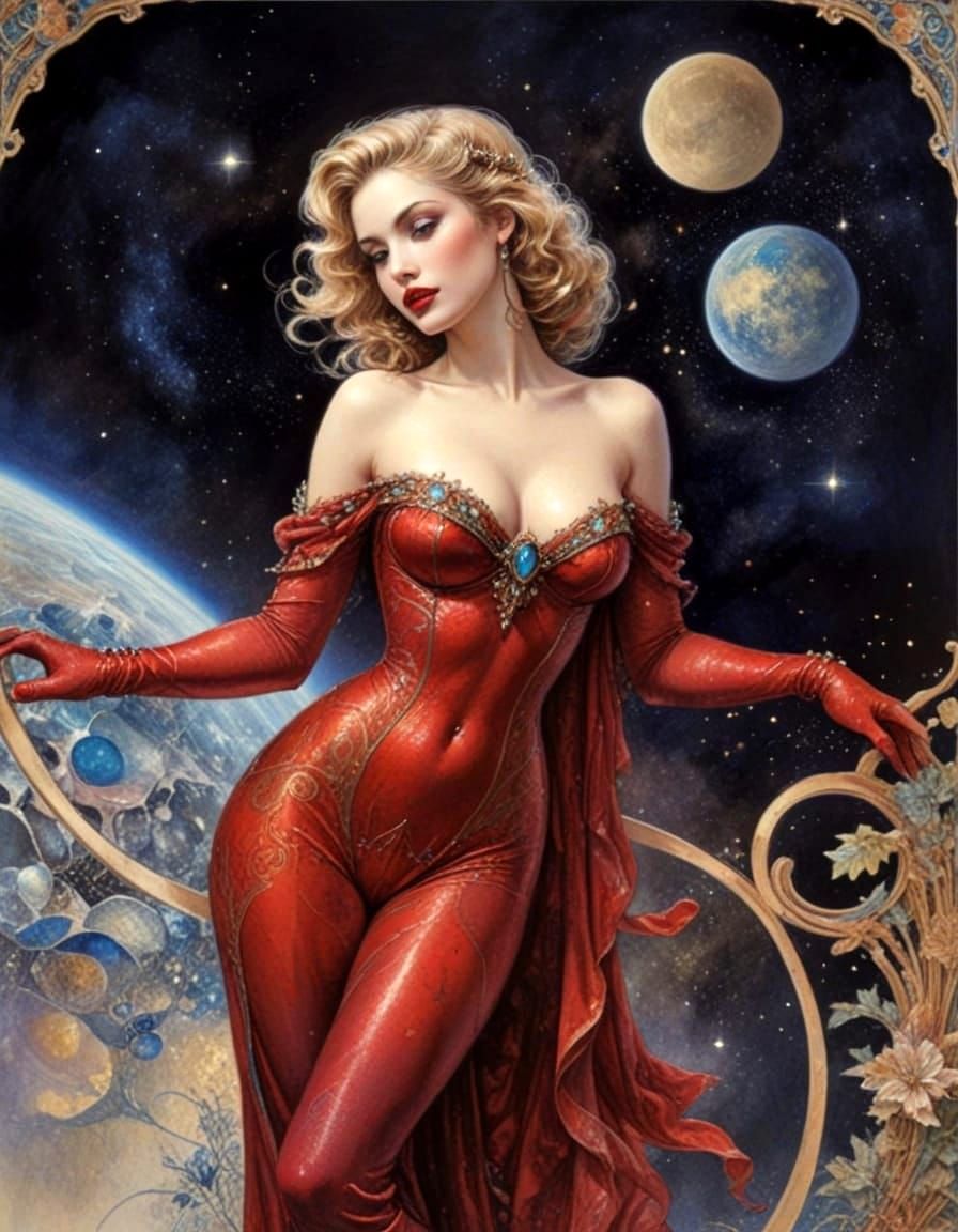 This image shows a retro-scifi watercolor of a space woman in a racy costume. The artwork features art nouveau elements, fine line scribbles, and a colorful, antique fantasy aesthetic.