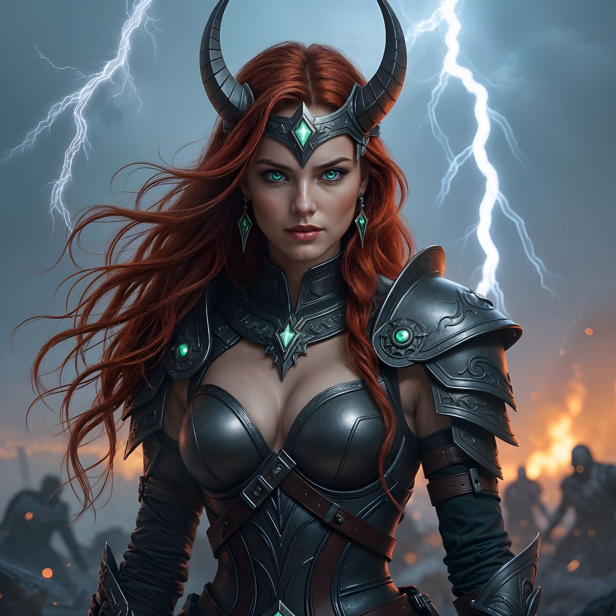 A striking picture of a valkyrie warrior on a stormy battlefield. She has fiery red hair, emerald eyes, celestial armor, and a horned helmet, all rendered with dynamic lighting and cool colors.