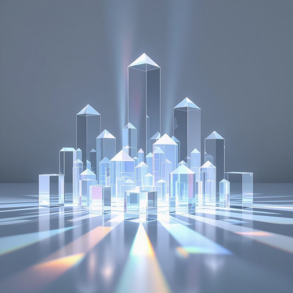 An abstract cityscape composed of transparent glass prisms, resembling geometric towers. Soft light beams and spectral gradients create a serene, orderly scene with clean lines and architectural balance.