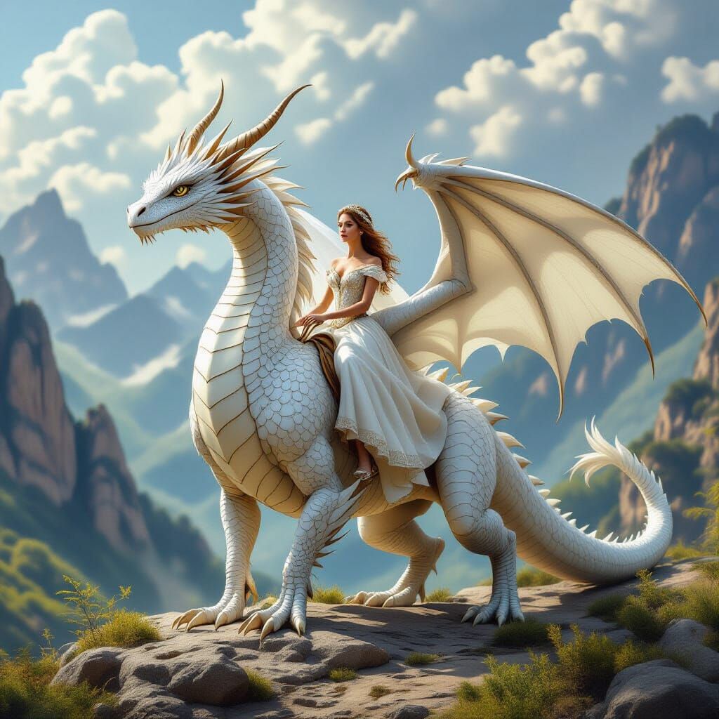 A majestic white and brown dragon with a princess rider in a stunning natural setting. This fantasy concept art features dramatic lighting, highlighting the grandeur of the landscape and the dragon.