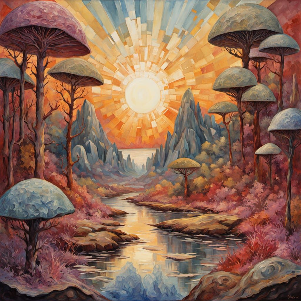 A digital rendering of an inverted heart within a geometric landscape. This artwork features fine lines, a chalky musk palette, and prismatic lighting to create a serene, panoramic view in gouache and watercolor style.
