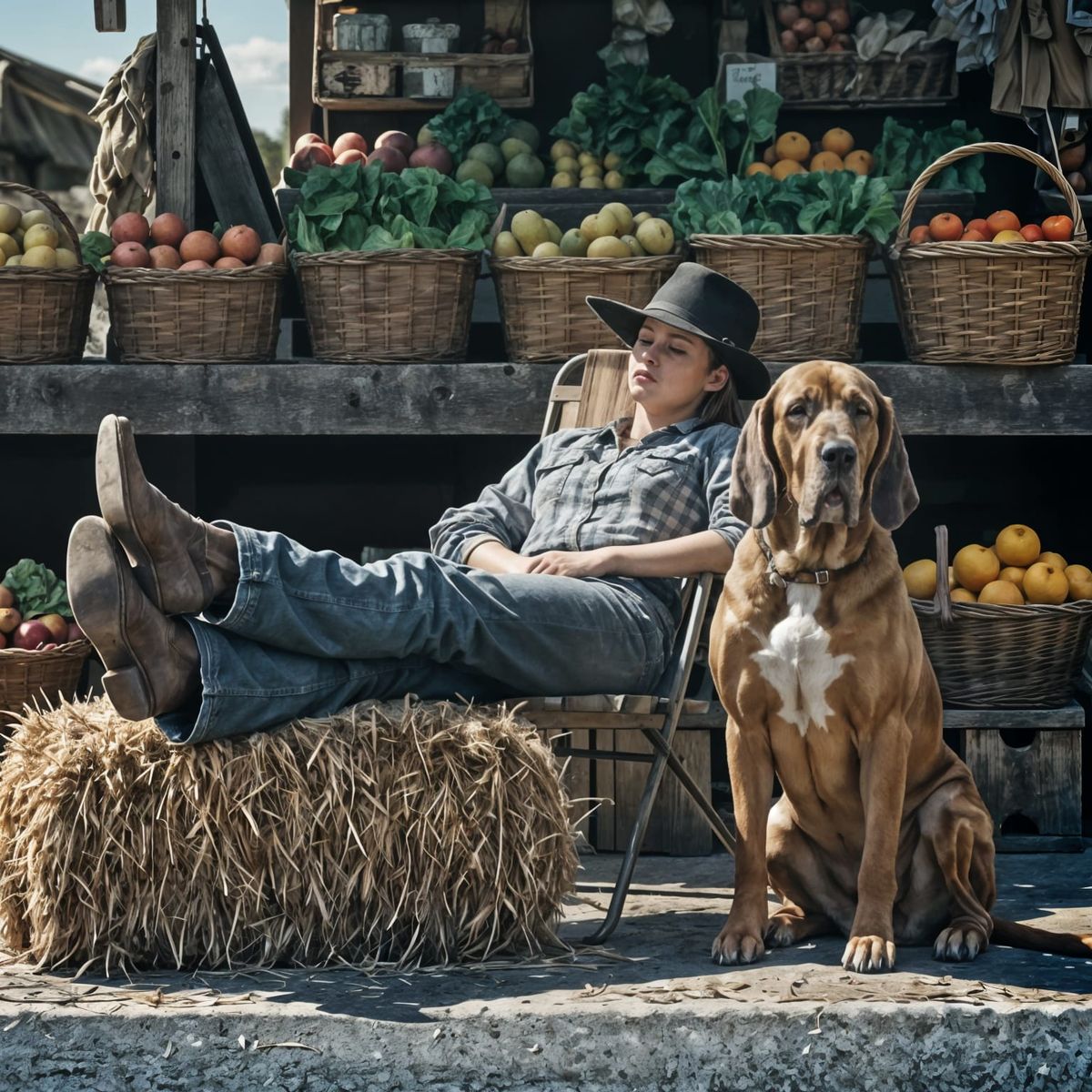 A hyper-realistic image of a cowgirl resting on a chair at a farmstand, with a bloodhound beside her. Features moody lighting and cinematic detail.