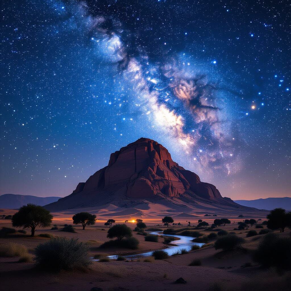 This hyperrealistic image shows Jebel Barkal mountain against a stunning Milky Way resembling a celestial river. Photographed with long exposure, it features deep blues and brilliant stars in a cinematic style.
