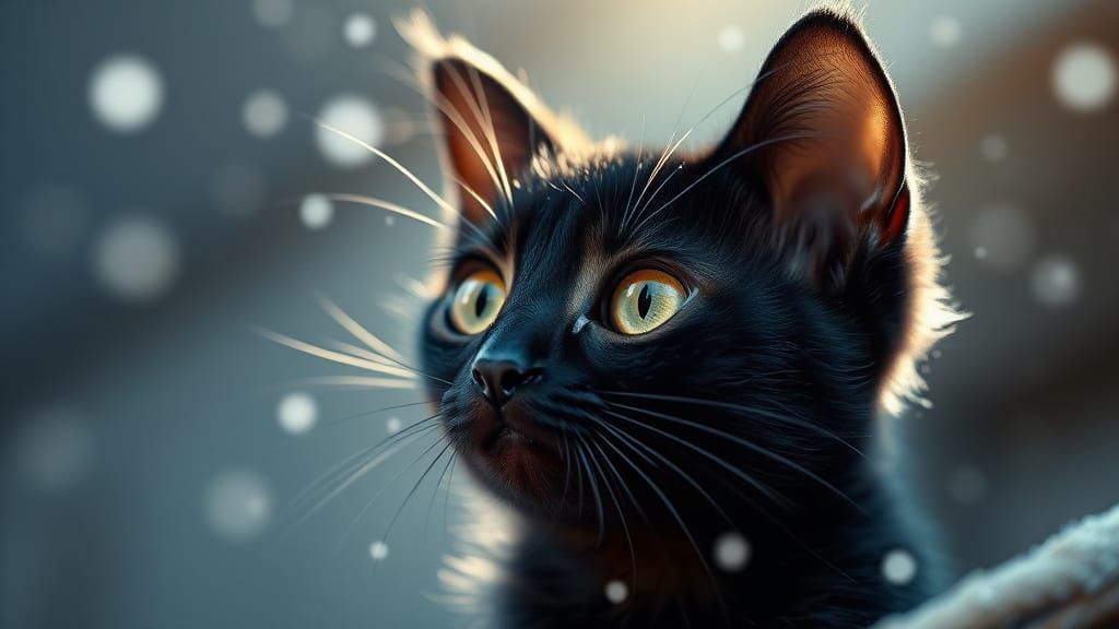 A captivating black cat sits in a crouched position, its bright golden eyes shining in the darkness, surrounded by a soft and luminous aura, captured in a whimsical and fantastical style with hyperdetail and a warm, golden glow.