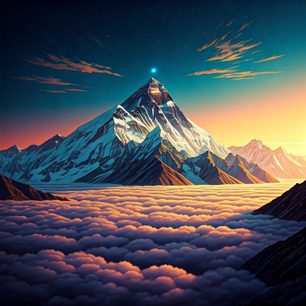 A breathtaking image of Mount Everest rises above wispy clouds, with the snow-capped summit shining like crystal in dawn's soft light. The clouds swirl in shades of saffron and amethyst, as the sky transitions to indigo, studded with stardust and celestial bodies, evoking cosmic wonder.