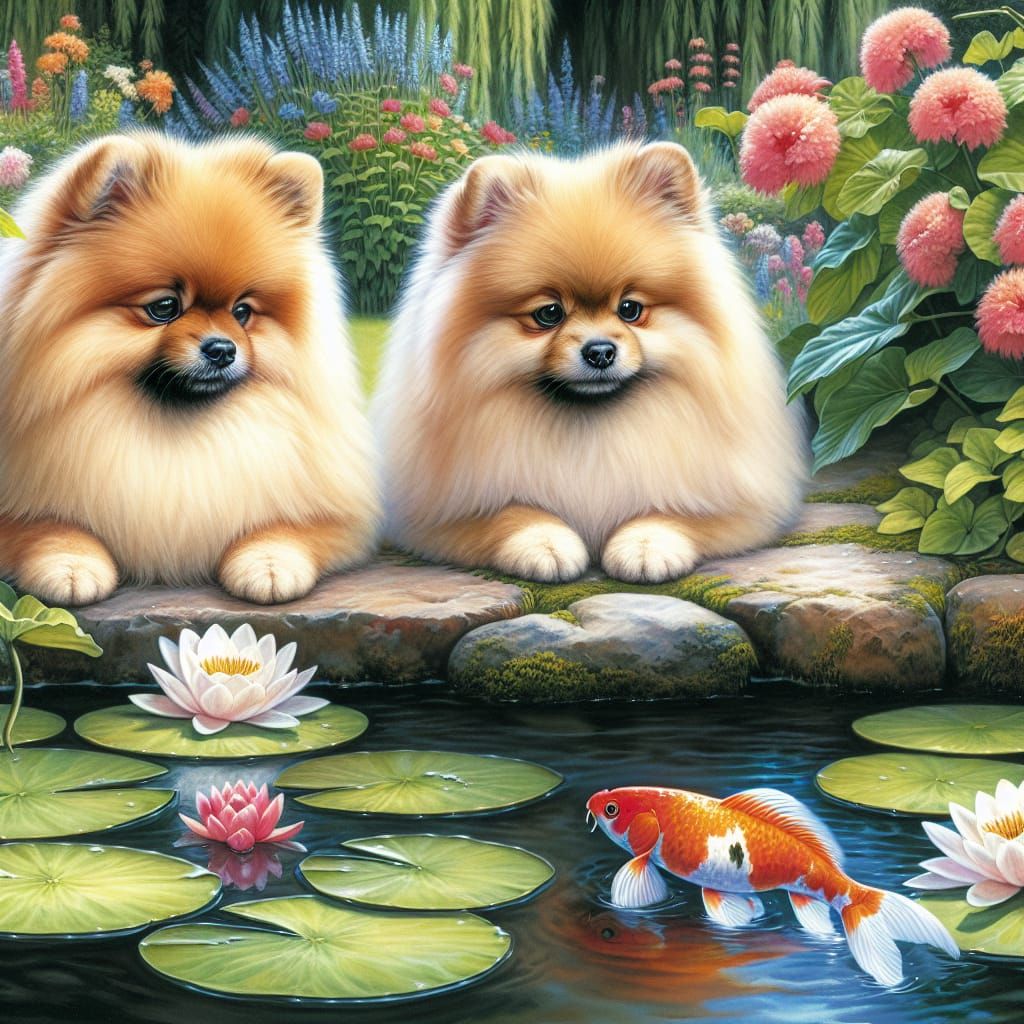 A vibrant watercolor painting of two fluffy Pomeranian dogs sitting by a pond. The dogs are watching a brightly colored koi fish swimming among water lilies in this idyllic scene.