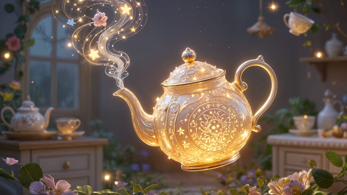 This image shows a magical, hyper-detailed teapot floating in midair. It features ornate patterns, glowing runes, and steam forming whimsical creatures with swirling light.