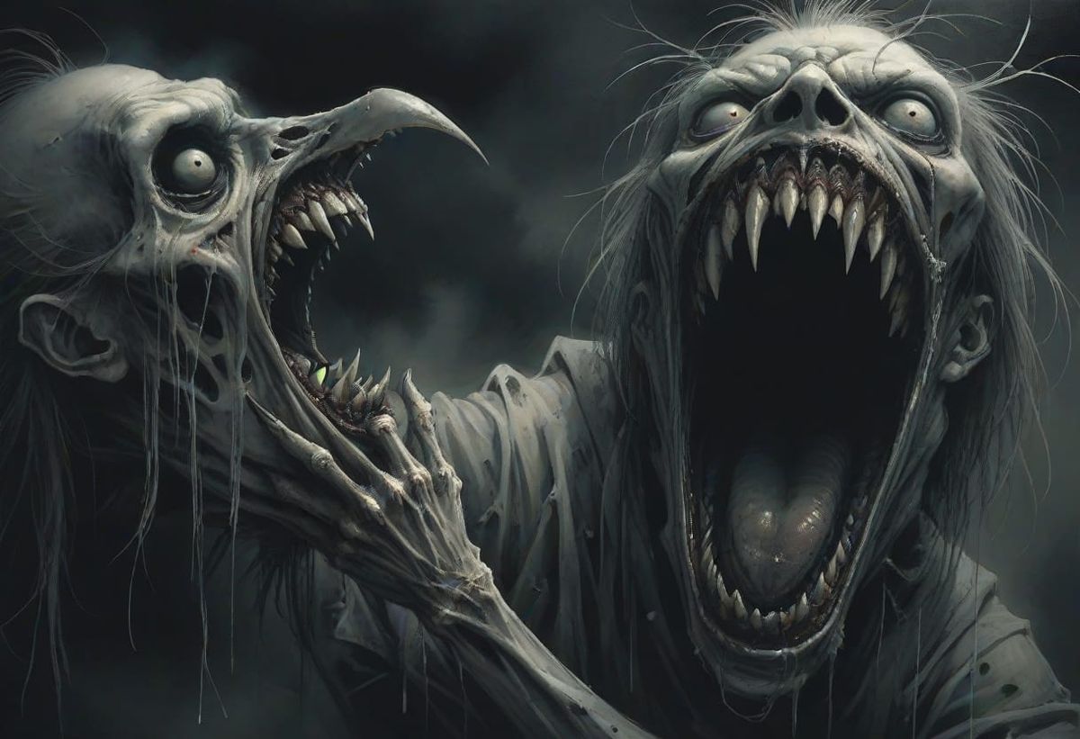 This image depicts a terrifying dentist, rendered in a dark, macabre artistic style reminiscent of Stephen Gammell's horror illustrations.