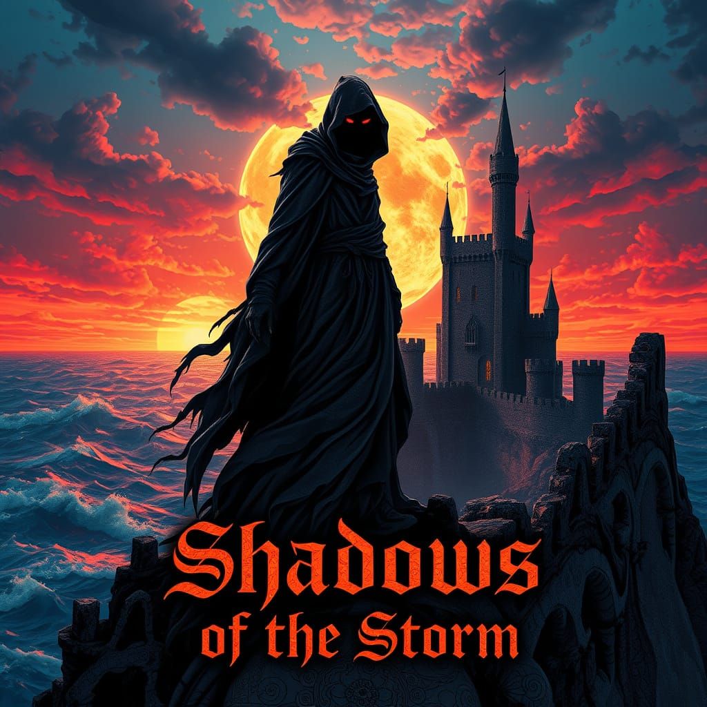 This image shows a solitary, cloaked figure on a ruined castle, gazing out at a stormy sea. The picture blends abstract fractals, Zentangle patterns, and 3D shading to create a dark fantasy aesthetic.
