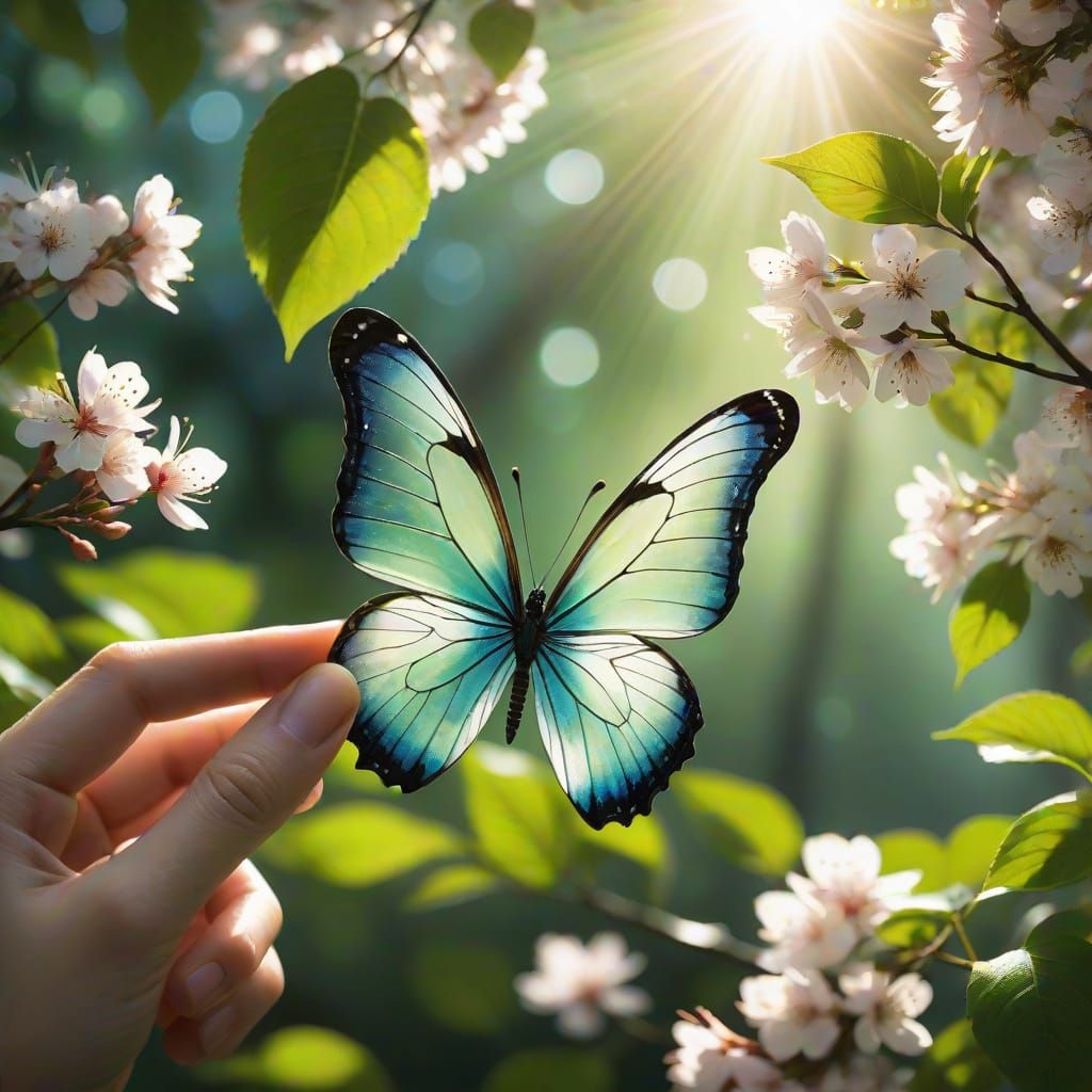 This image shows a fantasy butterfly with glass-like wings adorned with cherry blossoms, held by human fingers. Golden veins accentuate the wings, illuminated by a soft glow, against a blurred background of lush greenery.