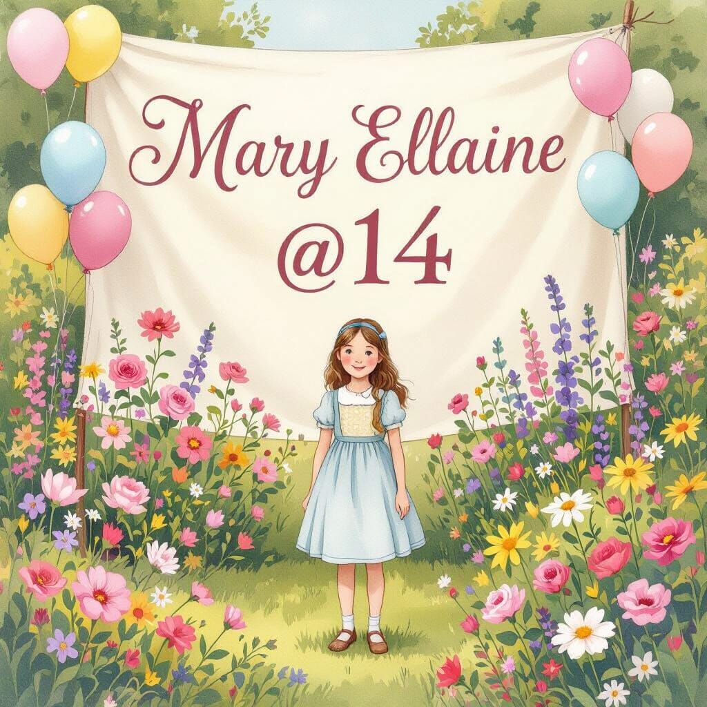 This image shows a young girl in a pastel-colored garden with balloons and flowers, and a sign with her name on it. The illustration style is soft, whimsical, and dreamy.