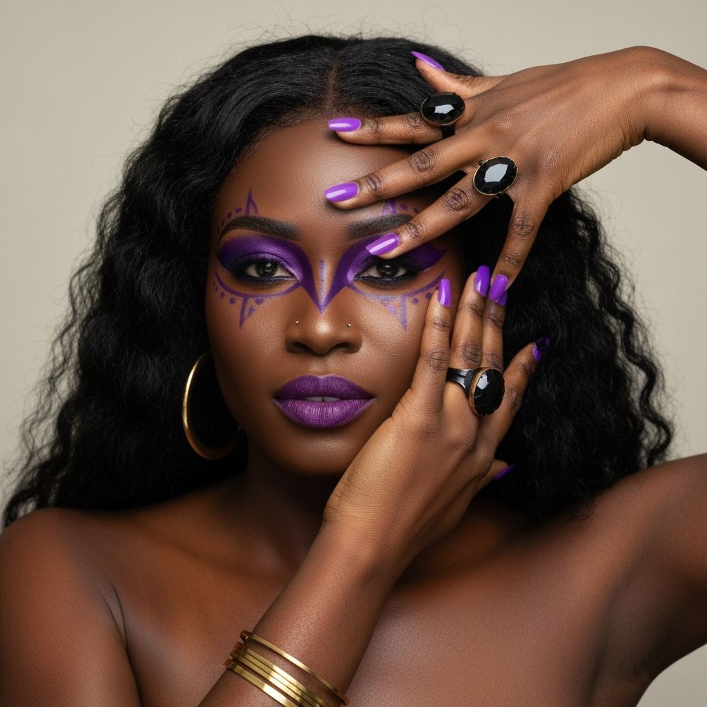 A captivating image of a woman with cascading hair and purple makeup. The portrait showcases geometric patterns and rich colors, enhanced by soft lighting and shallow depth of field. This image evokes a fine art photographic style.