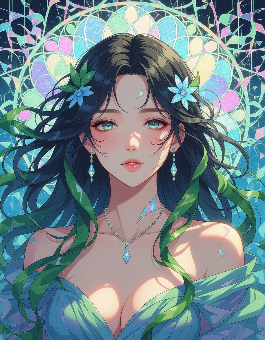 This image shows a surreal portrait of a woman with seaweed hair. Her face features glitch distortions, iridescent scales, and a pastel color palette in a broken digital aesthetic.