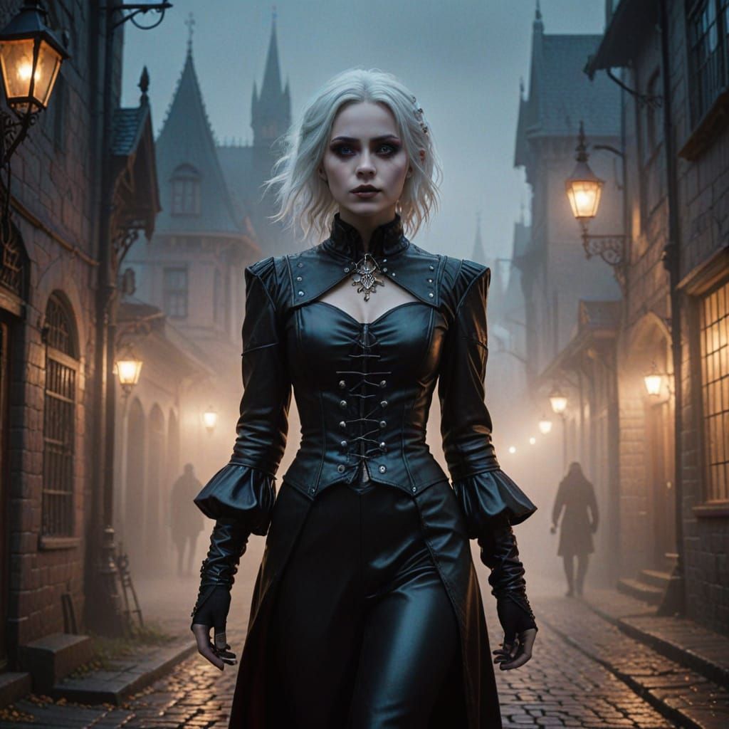 A gothic woman with white hair and pale eyes walks through a spooky twilight town. The dark fantasy style is emphasized by muted colors, dramatic shadows, and misty fog, creating a moody atmosphere.