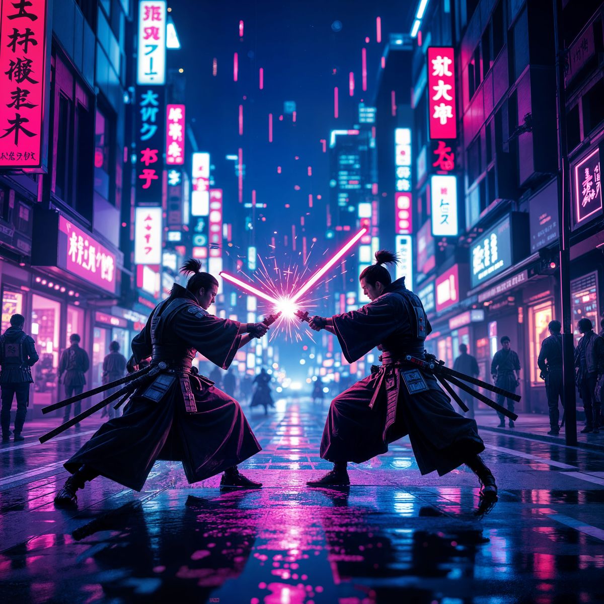This image captures a dramatic, cinematic showdown between two futuristic samurai warriors amidst the vibrant neon lights of Tokyo. Experience a high-octane, 8K visual spectacle.