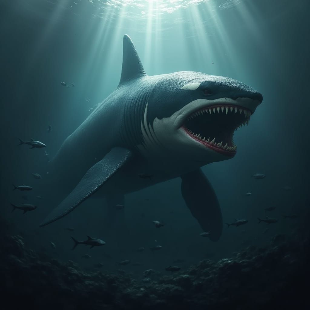 This image depicts a frightening hybrid of a great white shark and orca, rising from dark, choppy seas. Small fish flee the scene under dramatic, moody lighting. Created in a dark fantasy concept art style with hyperrealistic textures and a cinematic feel.