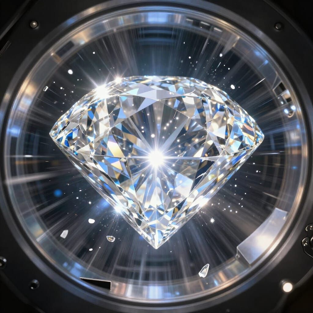 This image shows a massive diamond emitting blinding light, cracking a high-tech vault. Shards fly outward in a dynamic, cinematic scene with dramatic reflections.