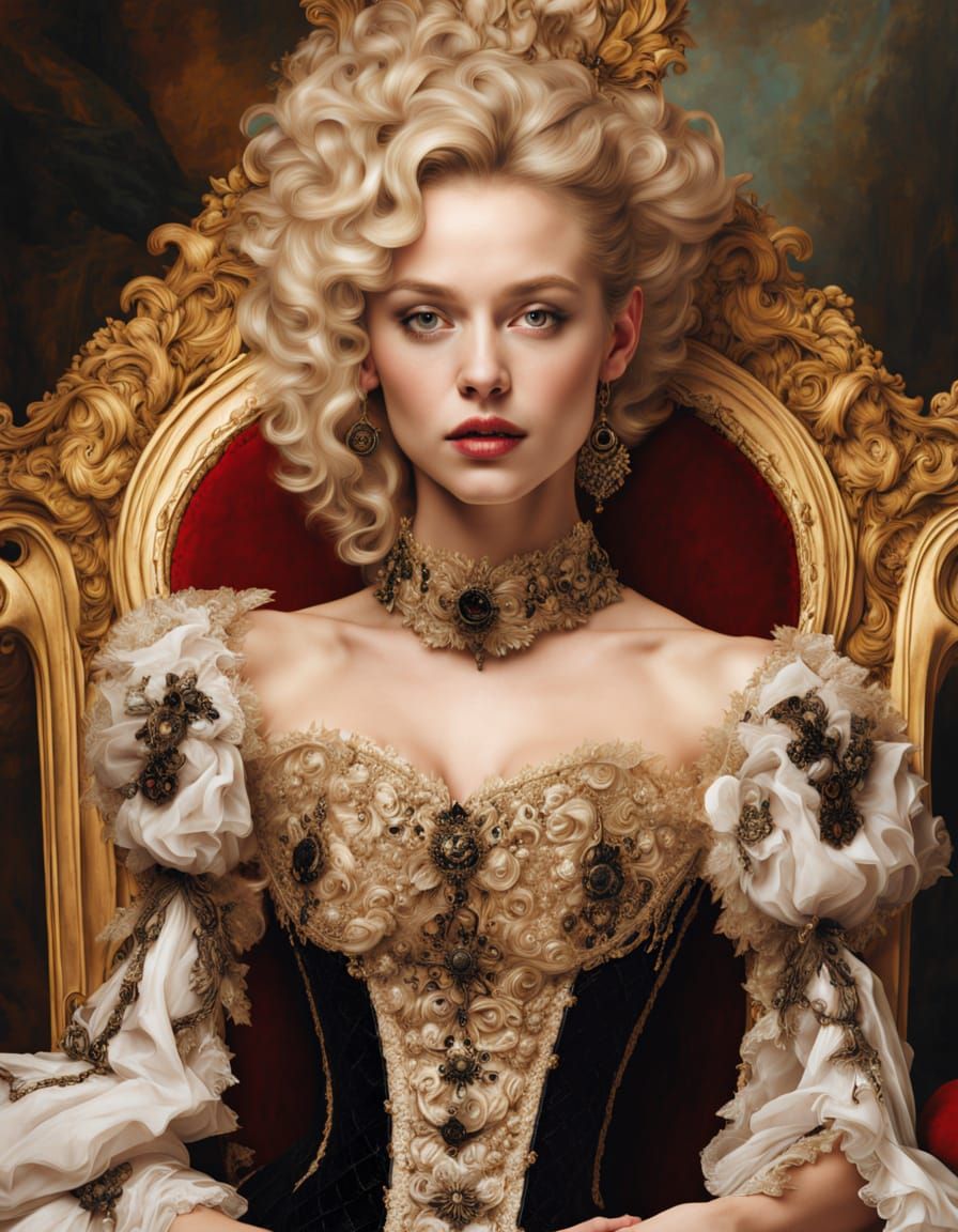 This image is a highly detailed, realistic portrait of a young blonde woman sitting on a throne, showcasing intricate corset details and rich, velvet textures in a warm, golden light, reminiscent of 17th-century Baroque oil painting style.