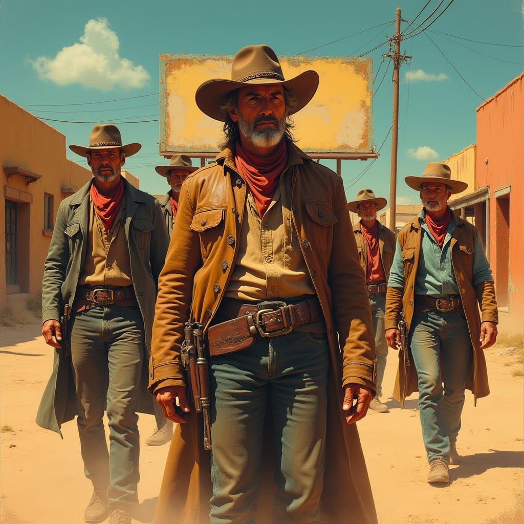 This image captures a band of outlaws in a sun-drenched Mexican town, portrayed with the dramatic flair of a Spaghetti Western. The scene features bold colors and high contrast, reminiscent of classic cinema.