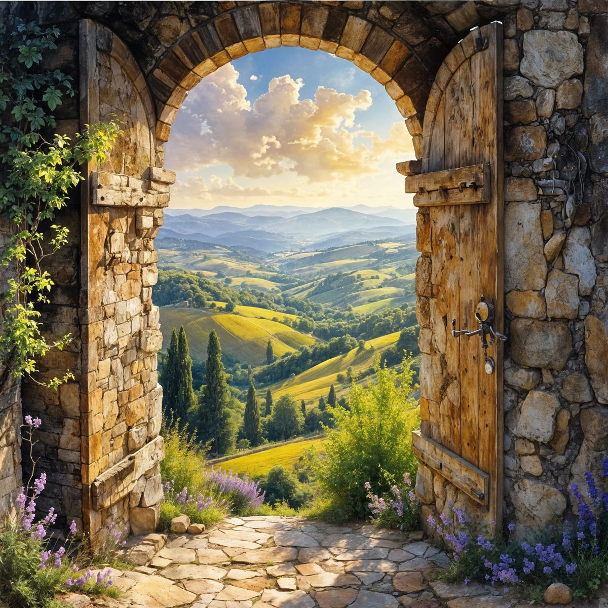 Generate unique images of castle windows overlooking stunning landscapes. Free and easy AI image creation.