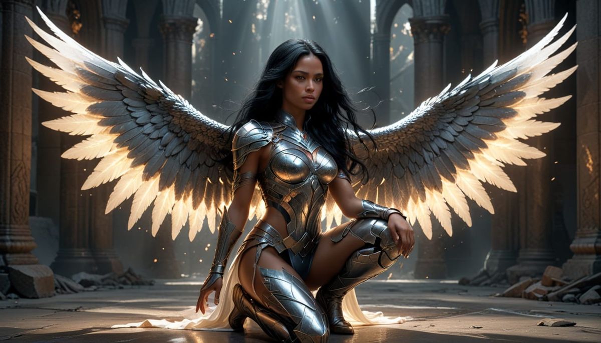 This digital painting showcases a powerful 22-year-old Dominican woman with angelic wings, kneeling in a heroic stance. Featuring detailed musculature and elegant armor, it's bathed in rich, cinematic jewel tones.