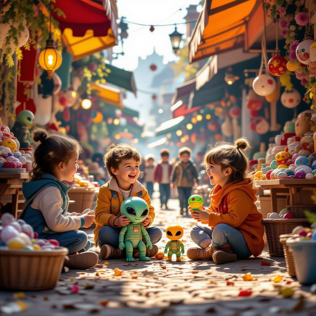 This image captures a joyful scene of children playing with alien toys in an alien market, rendered with warm colors and volumetric lighting to evoke a sense of nostalgia.