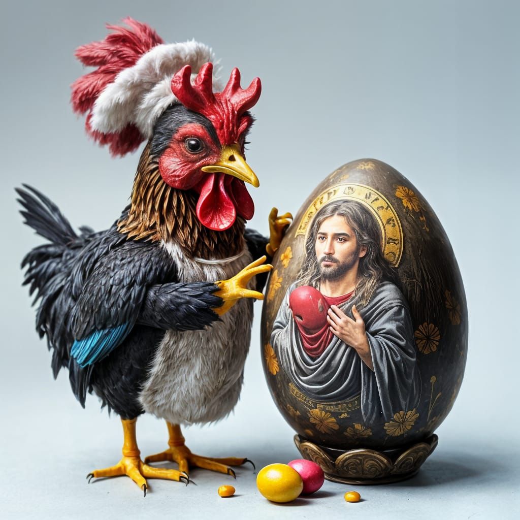 This image shows a creative chicken crafting a beautifully decorated Easter egg in the style of surrealism, blending humor and fantasy.