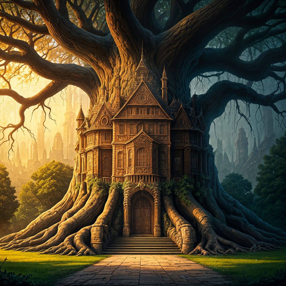 This image shows a whimsical miniature wooden mansion nestled in the branches of a large tree in the yard of a grand estate, resembling a playful treehouse.