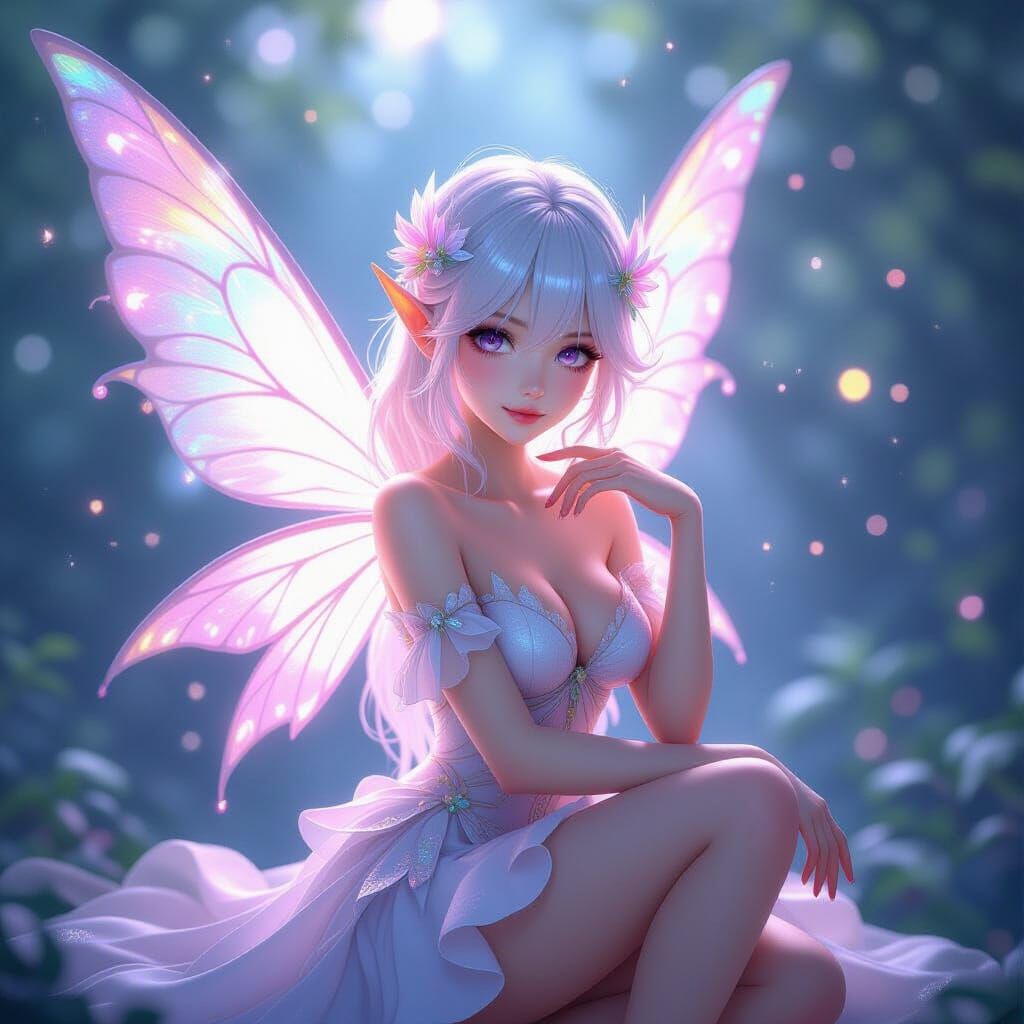 This image shows a realistic 3D anime-style portrait of a beautiful fairy girl with glowing wings and iridescent hair, set in a magical, sparkling scene with soft bokeh.