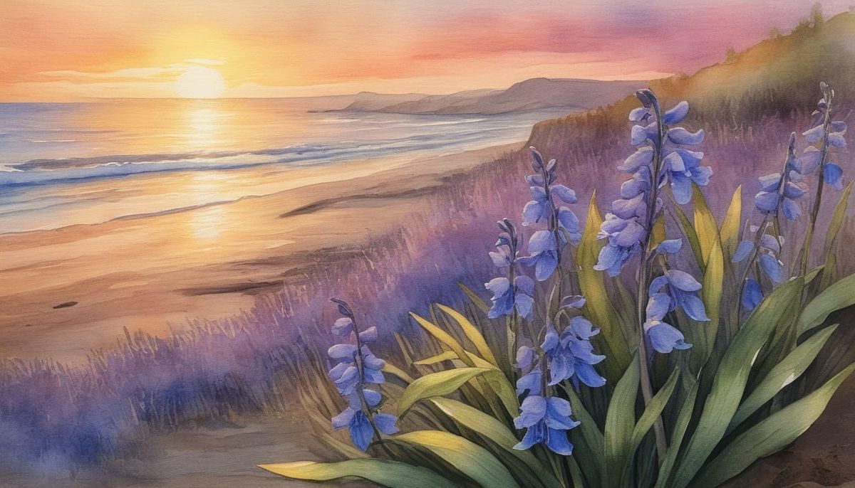 This image features a close-up of delicate bluebells nestled among weathered beachwood, set against a warm and serene golden sunset with intricate textures and soft, glowing petals.