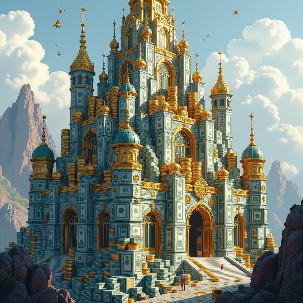 This AI-generated image depicts a grand fortress built from currency, featuring gold coins and banknotes. It showcases a unique fusion of Gothic and Art Deco aesthetics with intricate, visionary detailing.
