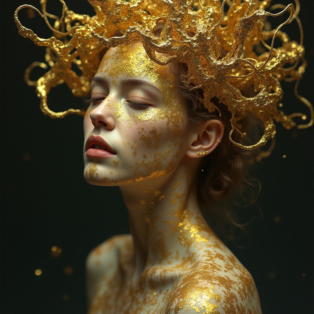This image shows a bizarre portrait with chaotic energy and hints of gold. The artwork features a dendritic, radioactive screen burn effect, reminiscent of Klimt's style.