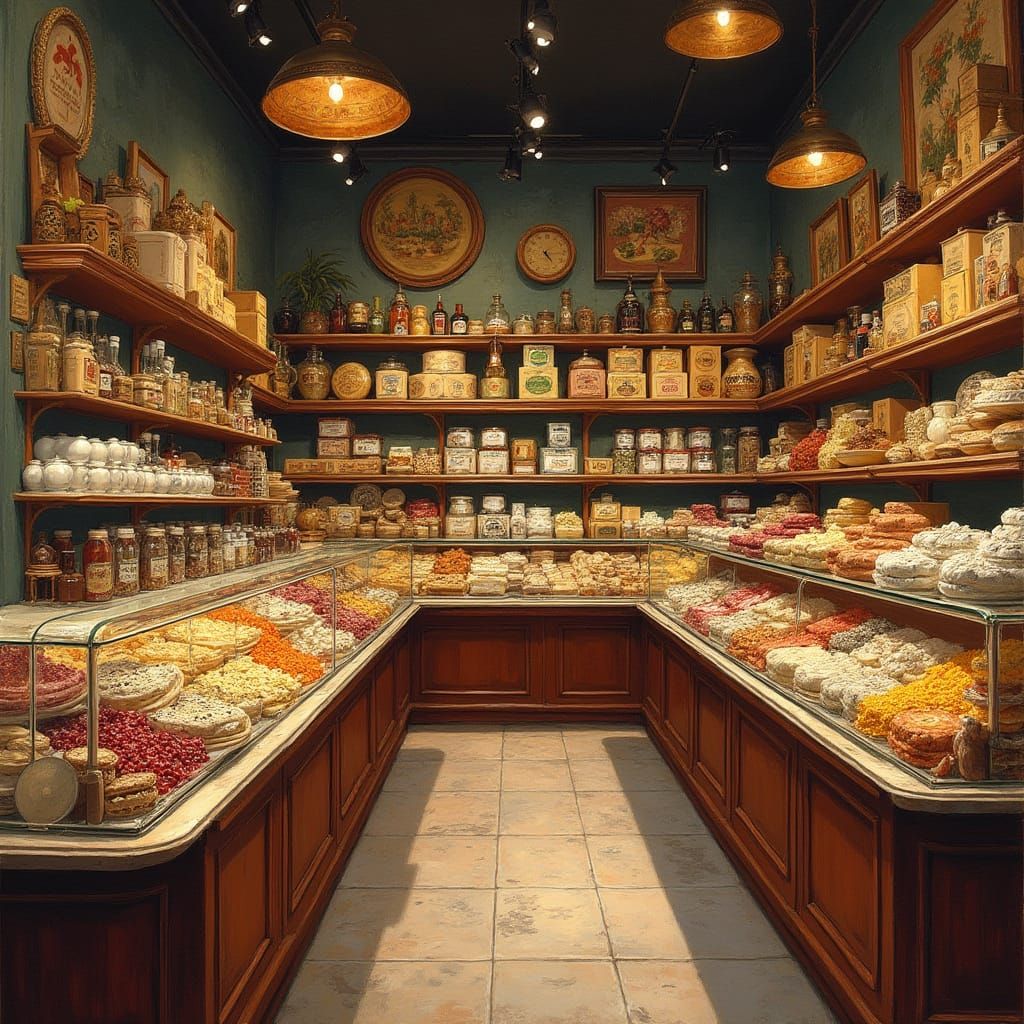 A vibrant gourmet shop overflowing with artisanal cheeses, cured meats, and exotic spices. The picture evokes the vibrant colors of pop art and intimate textures of impressionism.