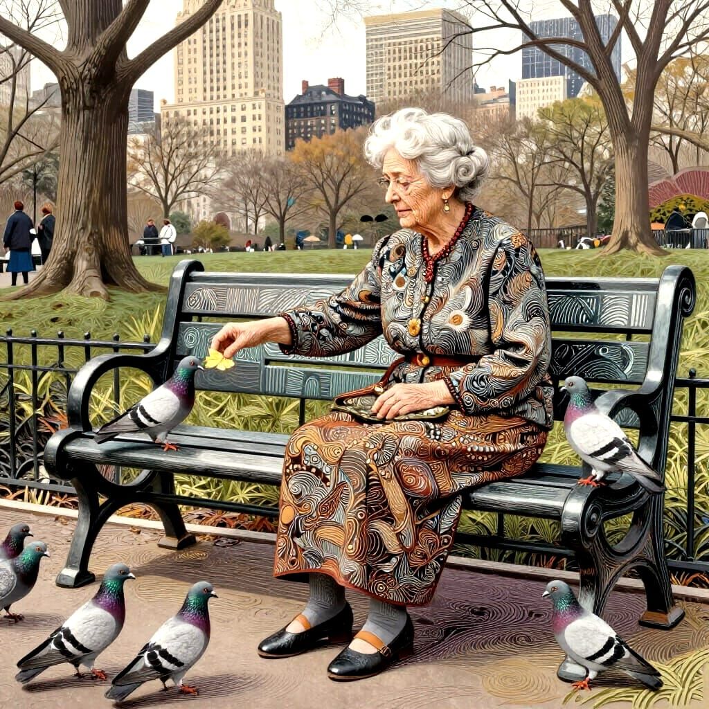 A hyperdetailed linocut style image of an eccentric elderly woman in 1923 New York feeding pigeons on an Art Deco bench.