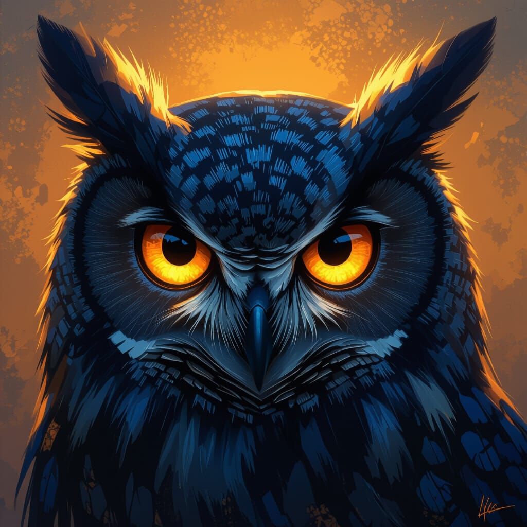 A close-up image of an owl's face featuring striking orange and gold eyes and detailed dark blue and black feathers. Rendered with sharp contrast and cinematic lighting, in a hyper-realistic digital painting style.