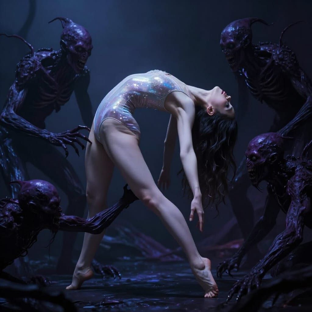 This image shows a serene woman in a glowing leotard performing a backbend while shadowy creatures attack. Rendered with dramatic lighting and a dark art aesthetic, she remains unfazed.