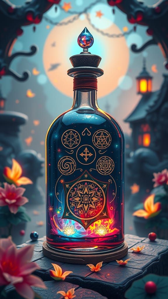 This image shows a vibrant ink bottle decorated with mystical symbols in a fantasy setting. The image has intricate details, deep colors, and complementary hues, rendered as a detailed matte painting.