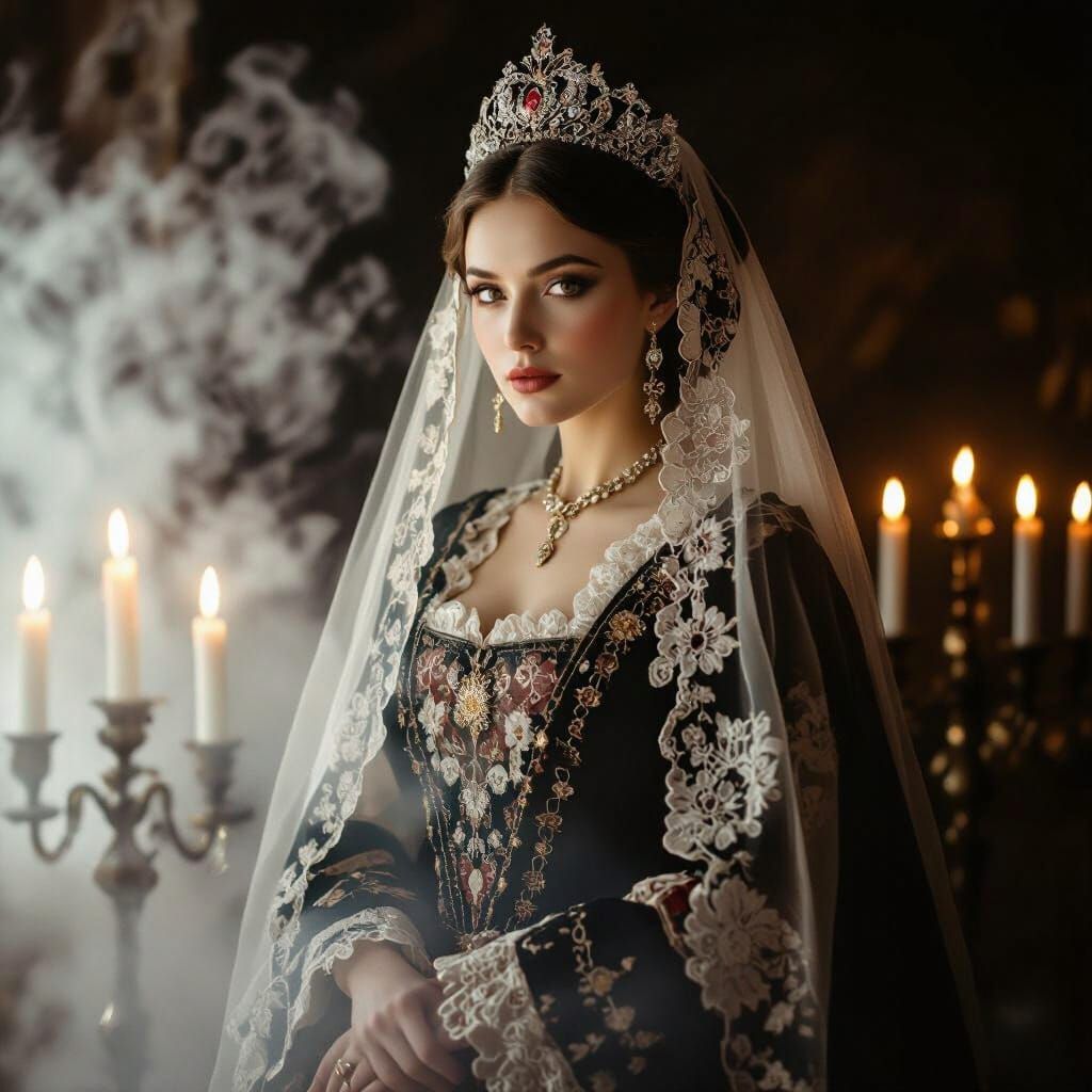 This image shows a beautiful tsarina in traditional mourning attire, veiled and ethereal. Captured in a sepia tone with soft focus and dramatic lighting, it evokes a vintage, ghostly atmosphere.