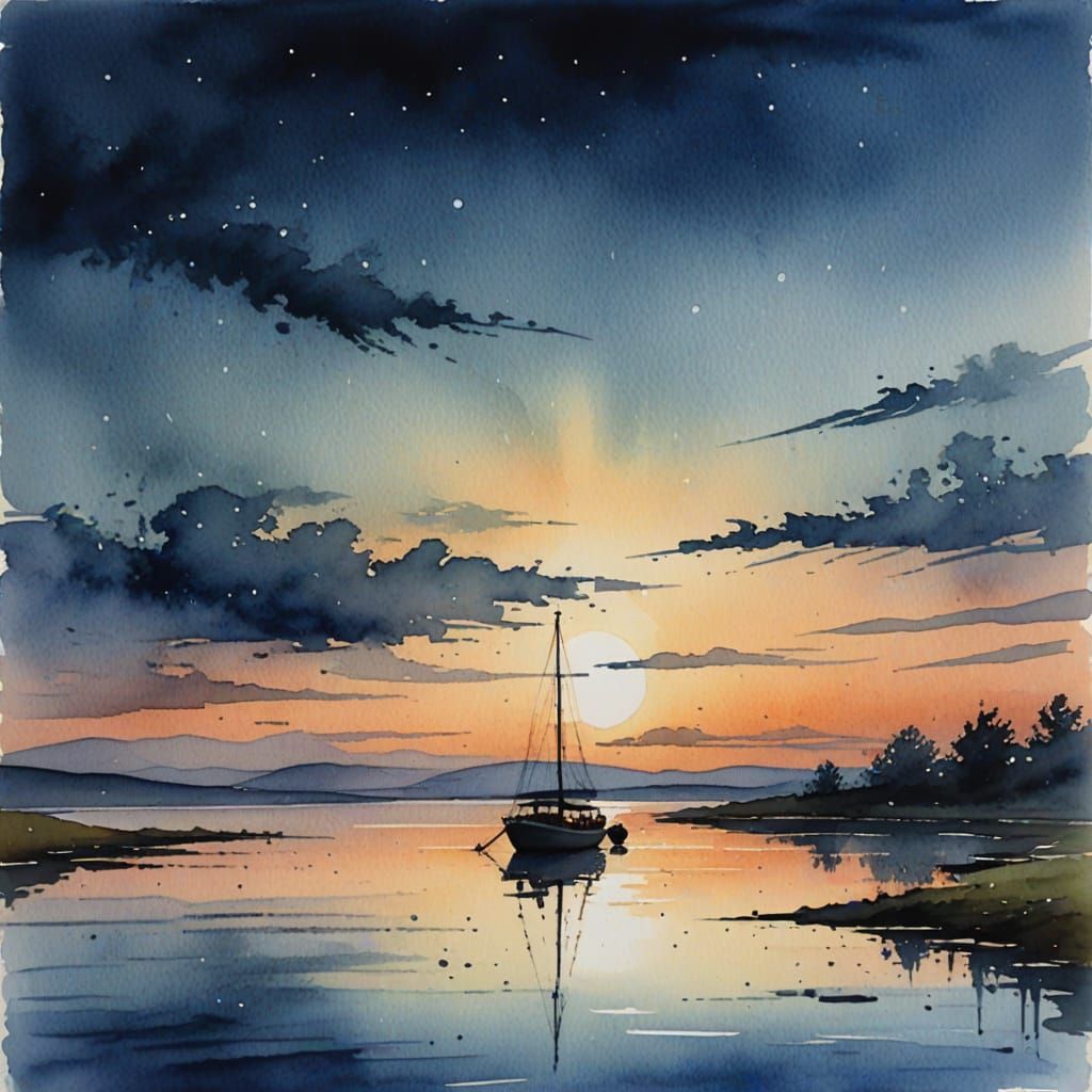 This image shows a serene watercolour painting of a boat slowly disappearing into the twilight horizon. The delicate brushstrokes and soft colours evoke a sense of calm and peacefulness.