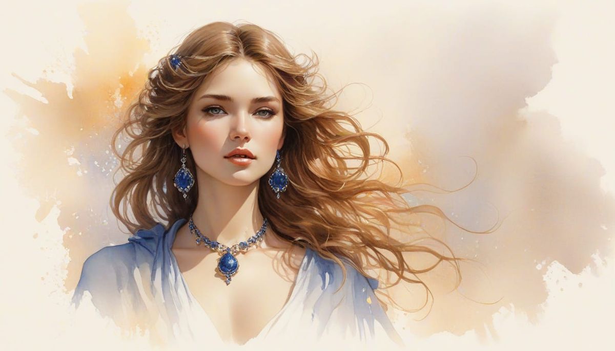 A striking portrait of a woman with flowing light brown hair wearing sapphire jewelry, rendered as an ink and watercolor wash. The image features dramatic brushstrokes and warm colors, evoking a dreamy, ethereal atmosphere.