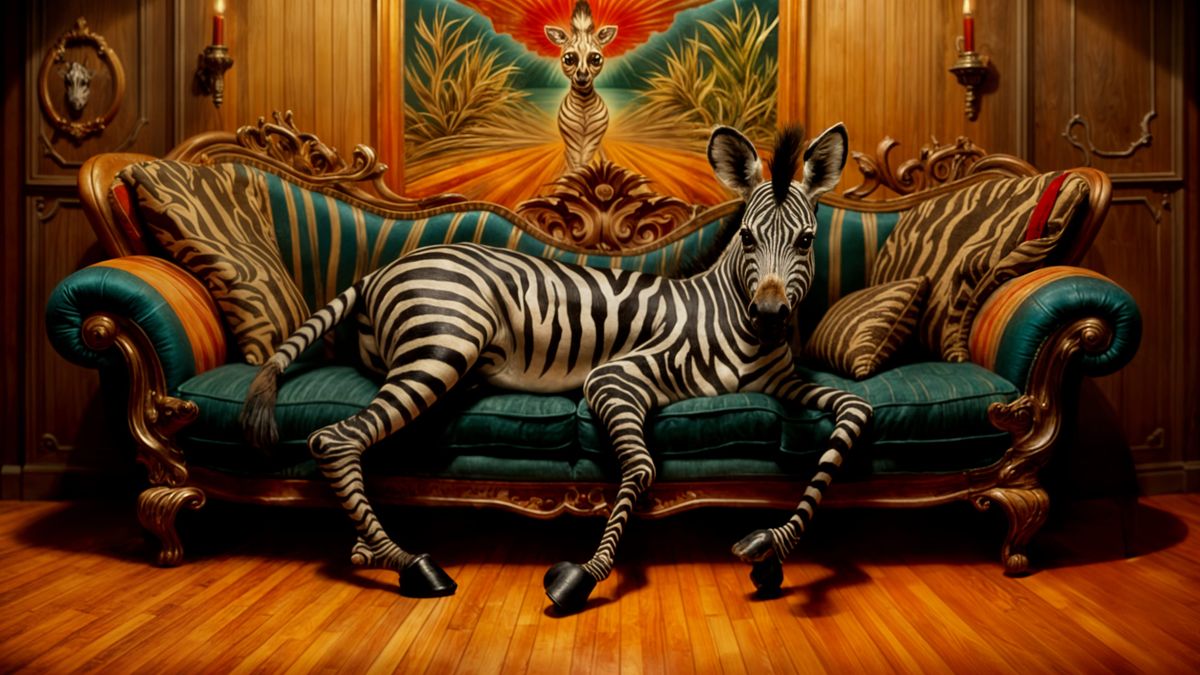 A zebra IS a sofa sitting on a hardwood floor in front of a simple wall. Her legs are tucked beneath her, from shoulder to hips is a seating area with sofa cushions. Her tail is wrapped around her body on the floor, her head is turned towards the viewer. <lora:Magic Charm:1.0> <lora:ZZ ZEBRAPUNK:1.0> ...