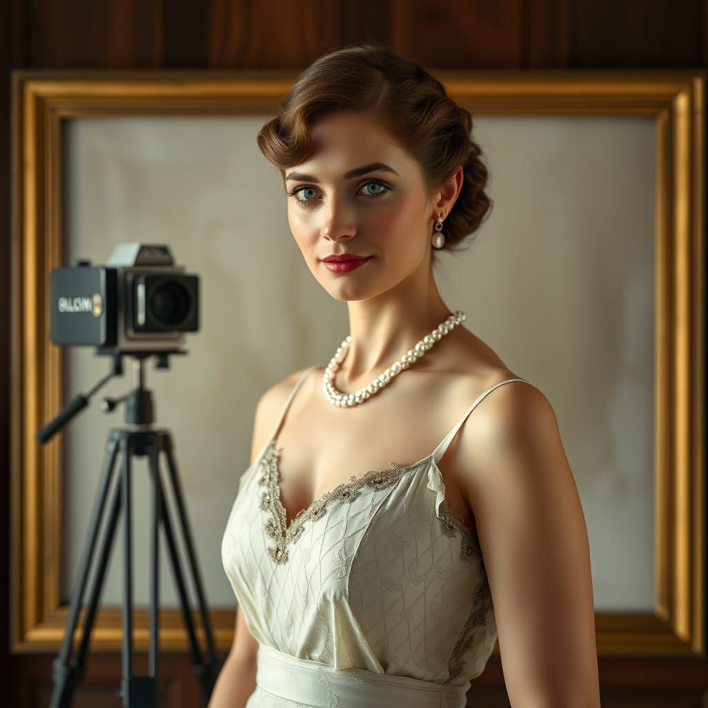 This image shows a woman in a 1920s dress posing by a vintage camera. The background features dark wood and gilded frames, in a soft, warm, and richly textured aesthetic.