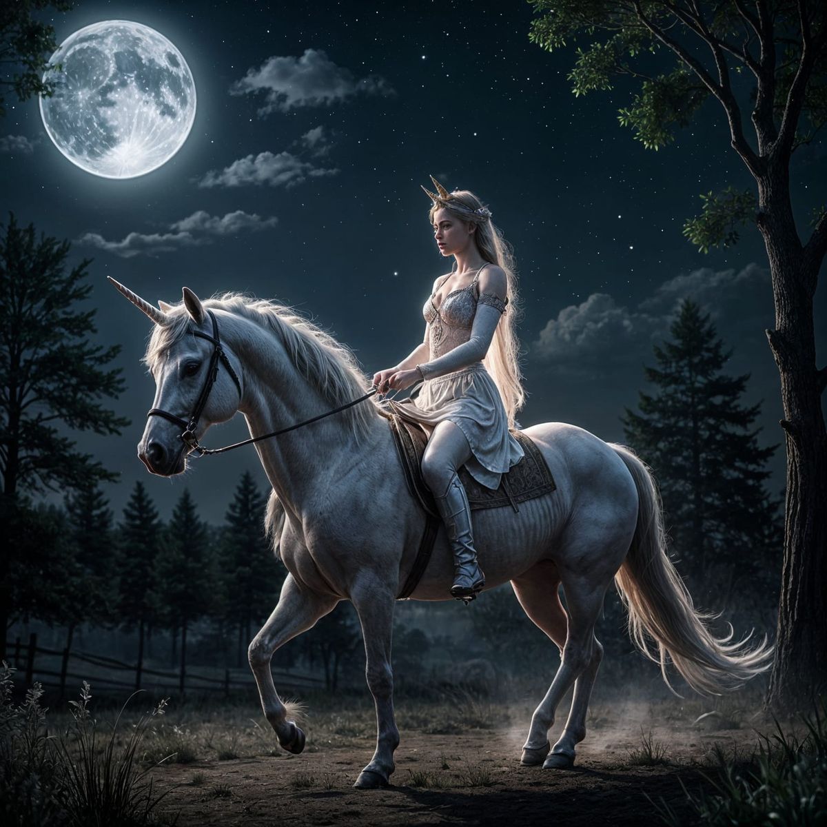 This image shows a regal princess riding a horse under the soft glow of the moon, with cinematic lighting and a mesmerizing atmosphere, bringing realism to this magical scene
