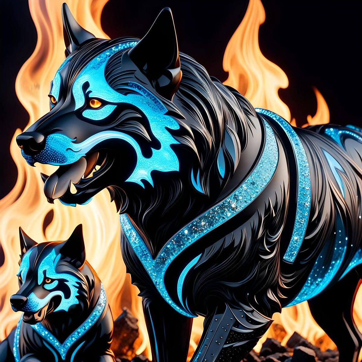 A striking picture of a glass Cerberus in a wasteland. The Art Deco illustration features a luminous, sparkly, glowing three-headed dog in a bioluminescent crystalline marquetry style with dripping lava.