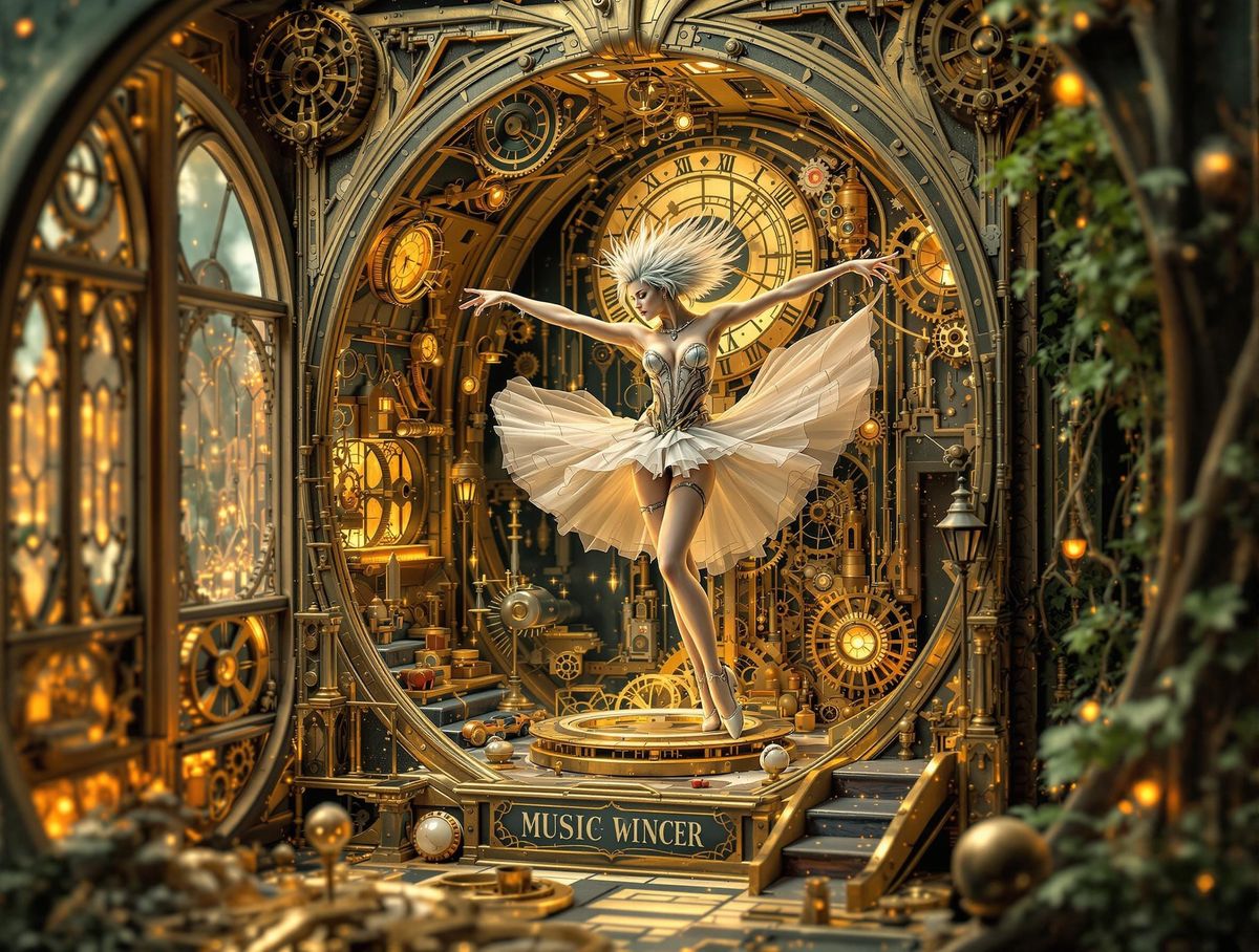A captivating image of an art nouveau dancer performing in a music box. The dancer has neon-silver hair and clockwork shoes, in a steampunk and cyberpunk aesthetic.
